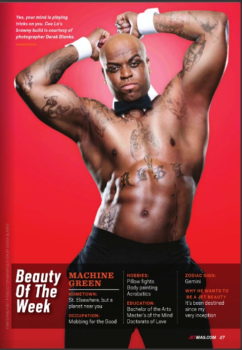 Cee -Lo Green = Beauty of The Week Posted on March 12, 2012 by RED In Da City! Beauty of the Week: “The Black Elton John” aka Cee-Lo Green is on the cover of Jet Magazine.. It’s always been a DREAM of his & thx 2 Photoshop it’s a Reality! I’m speechless…. Share this: Share on X (Opens in new window) X Share on Facebook (Opens in new window) Facebook Like Loading... Related